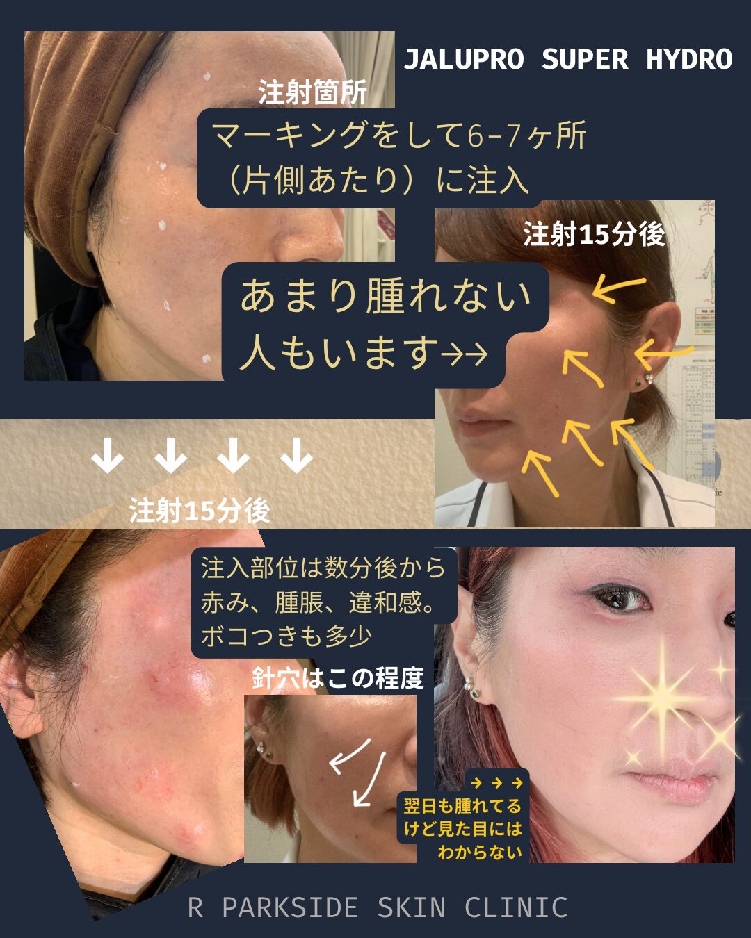 - クリームやテープ麻酔剤により表面麻酔後に施術しますので、注射の痛みは軽減されますが無痛ではありません。ジャルプロクラシックは額・左右の頬に各20−50箇所ずつ注入、ジャルプロスーパーハイドロは6−7箇所ずつ注入しますので、針の刺入による点状出血、部位により紫斑が出ることがあります。通常は数日以内に軽快します。紫斑は2週間以内に消えますが、メイクでカバー可能です。