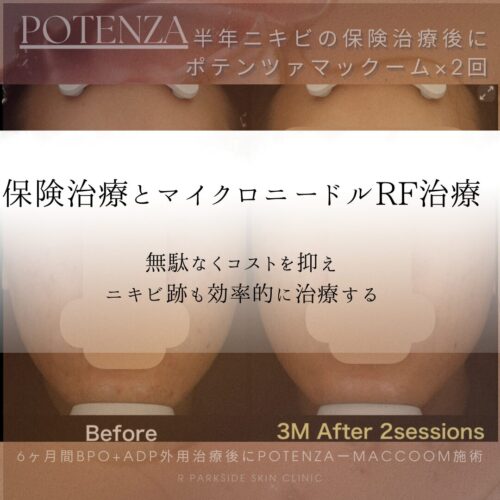 前回のブログでは、保険適応の治療をしっかりとやりながら、ニキビ痕の凹凸が目立つお肌を均一に整えていくためのデバイス治療(マイクロニードルRF=POTENZAによる治療・IPL照射=Elos Plus フォトSR照射)をご紹介しました。