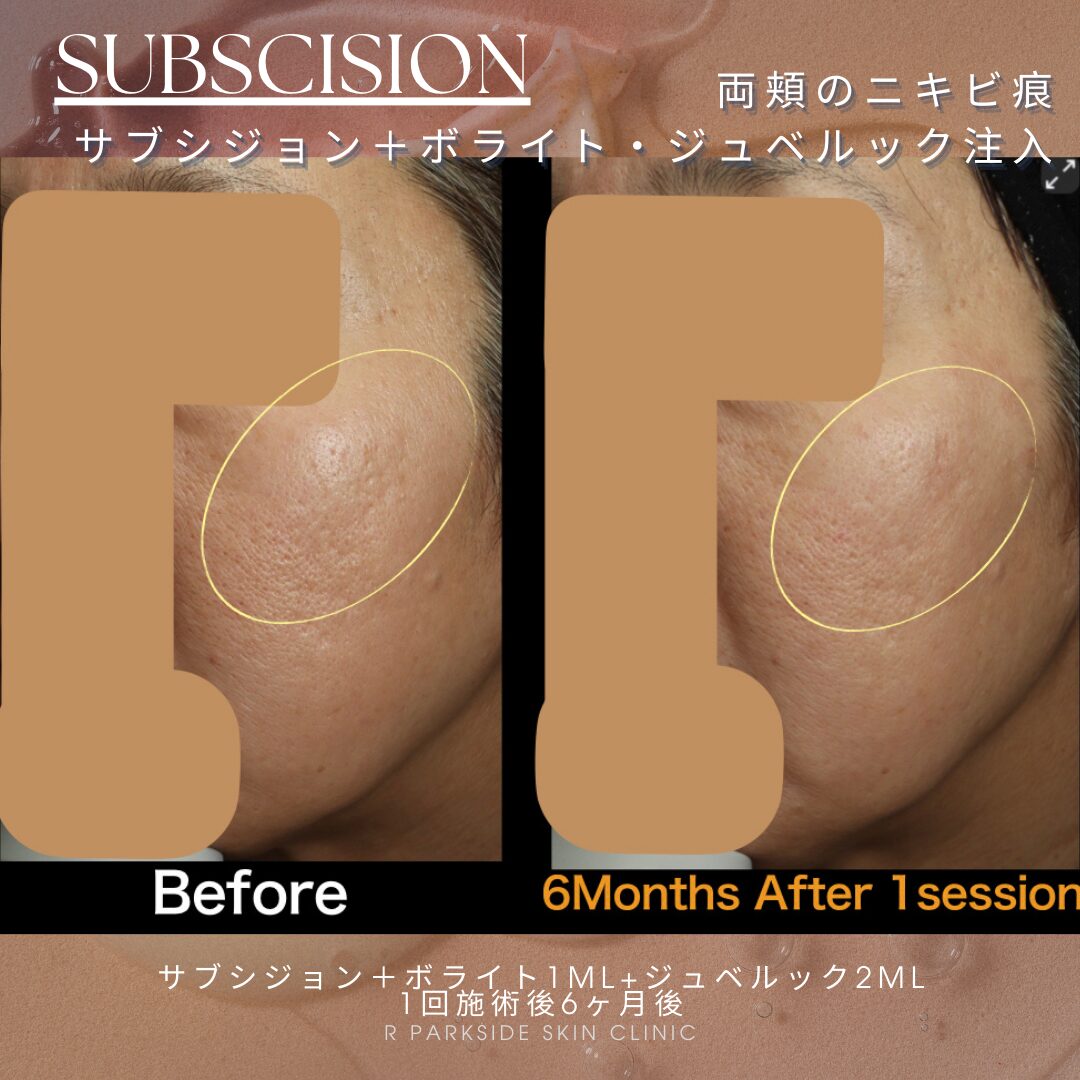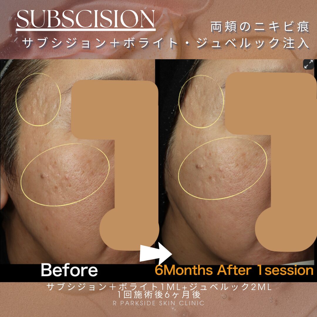 ジュベルックはポリ乳酸の一種(PDLLA)で、真皮内に注入すると、数ヶ月かけて異物反応を起こし結果としてコラーゲン増生を促進してくれるバイオスティミュレーターです。そのため、サブシジョンを行っていないところも全体的にふっくらハリが出て、凹凸がより目立ちにくくなる、という仕組みです。
