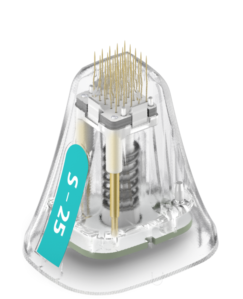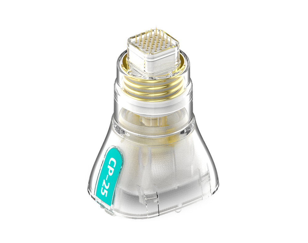 巊のような極现の針が25本぀いたチップを䜿い、肌に刺入しお針先から高呚波を流すこずで、皮膚の衚面には火傷を起こさずに、皮脂腺や真皮局を狙っお高呚波の効果を出す斜術です。こちらのCPチップは、曎に同時に薬液の泚入もできたす。