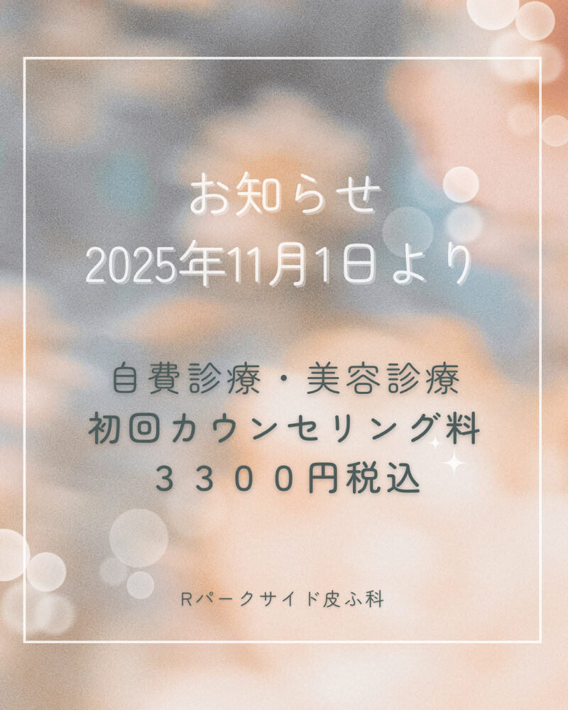 初診 カウンセリング料(または予約料) | お悩み事に 3,080円(処置料別途) ★例:シミ治療・たるみ治療はそれぞれ別途カウンセリング料が発生します。 ⭐️1度の診察でご相談できるのは原則1種類のお悩みとなります。 |