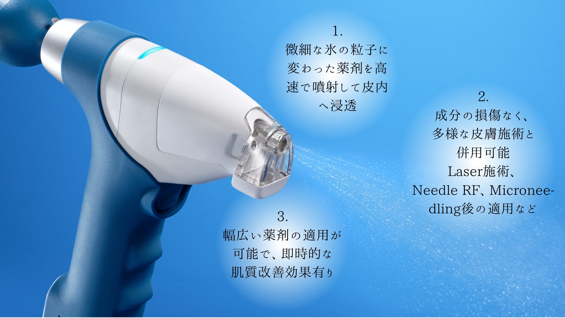 薬液を瞬間的に凍結し、炭酸ガスジェットで肌に噴射し導入する施術。薬液の真皮内導入+炭酸ガスによる血流改善・若返り効果、冷却による鎮静効果と、1石3鳥の効果が得られる最新アイスニードリング技術です。施術時間10分程度